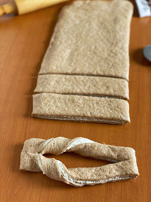 Ha megkelt a tésztánk, enyhén olajozott felületre borítjuk, majd kb. ujjnyi vastagságú téglalappá (kb. 30 x 70 cm) nyújtjuk. Az egyik felét egyenletesen megkenjük a túrókrémmel, majd ráborítjuk a tészta másik felét. Ekkor kb. 5 cm vastagságú csíkokra vágjuk, majd mindegyik kapott csík közepén, hosszanti irányban egy bemetszést ejtünk, ügyelve, hogy a végek egybe maradjanak.